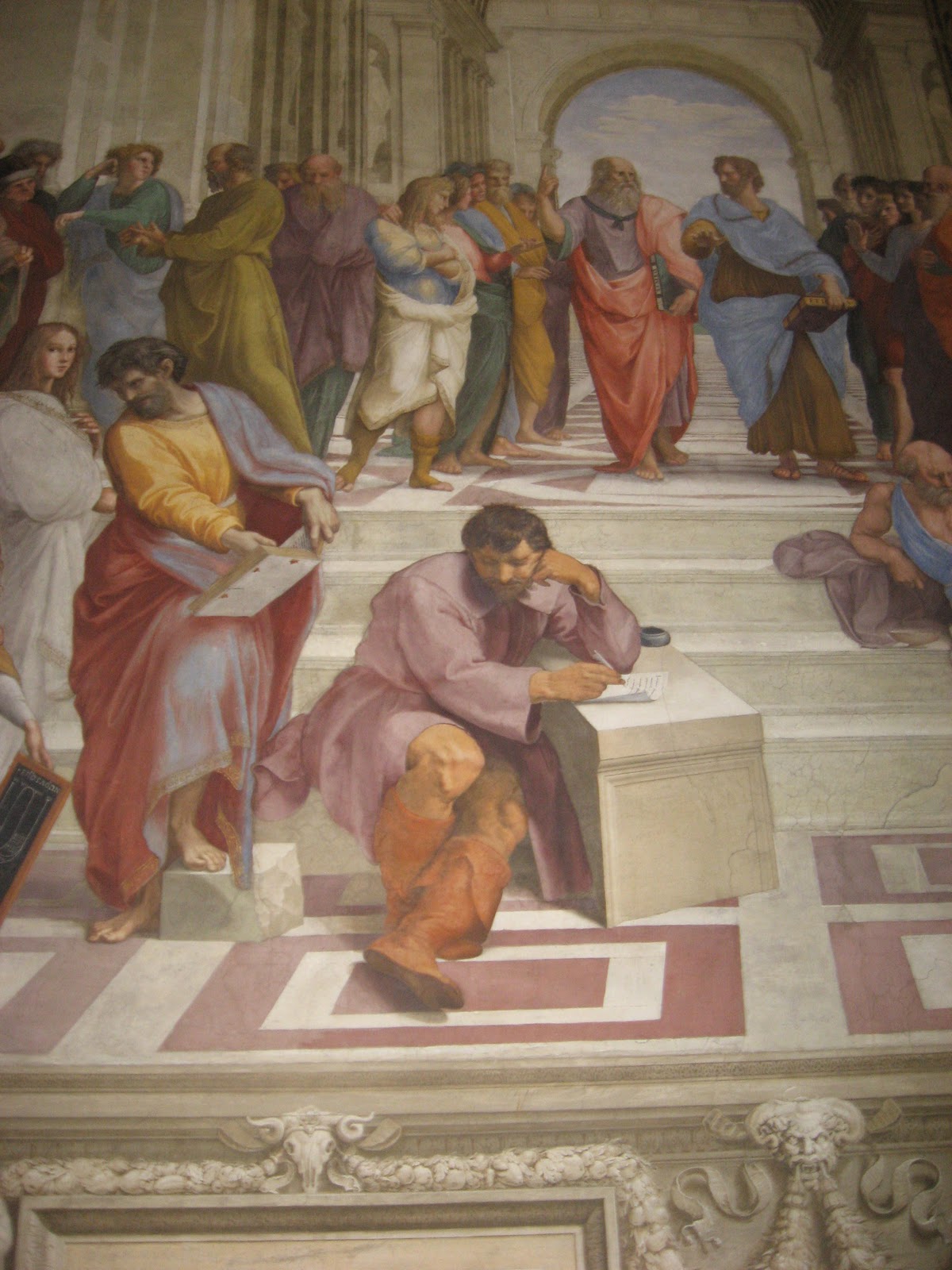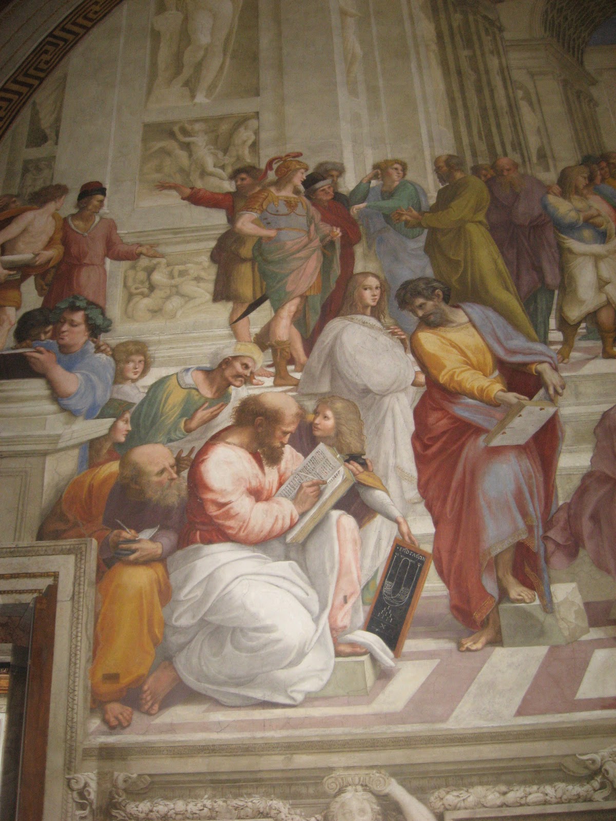The School of Athens is a Who’s Who of Greek leaning. Below are Plato and Aristole (top left), Diogenes (reclining on the steps) and Archimedes or Euclid (bottom right drawing with a compass). The man with dark hair in the bottom right is thought to be Rapahel himself.