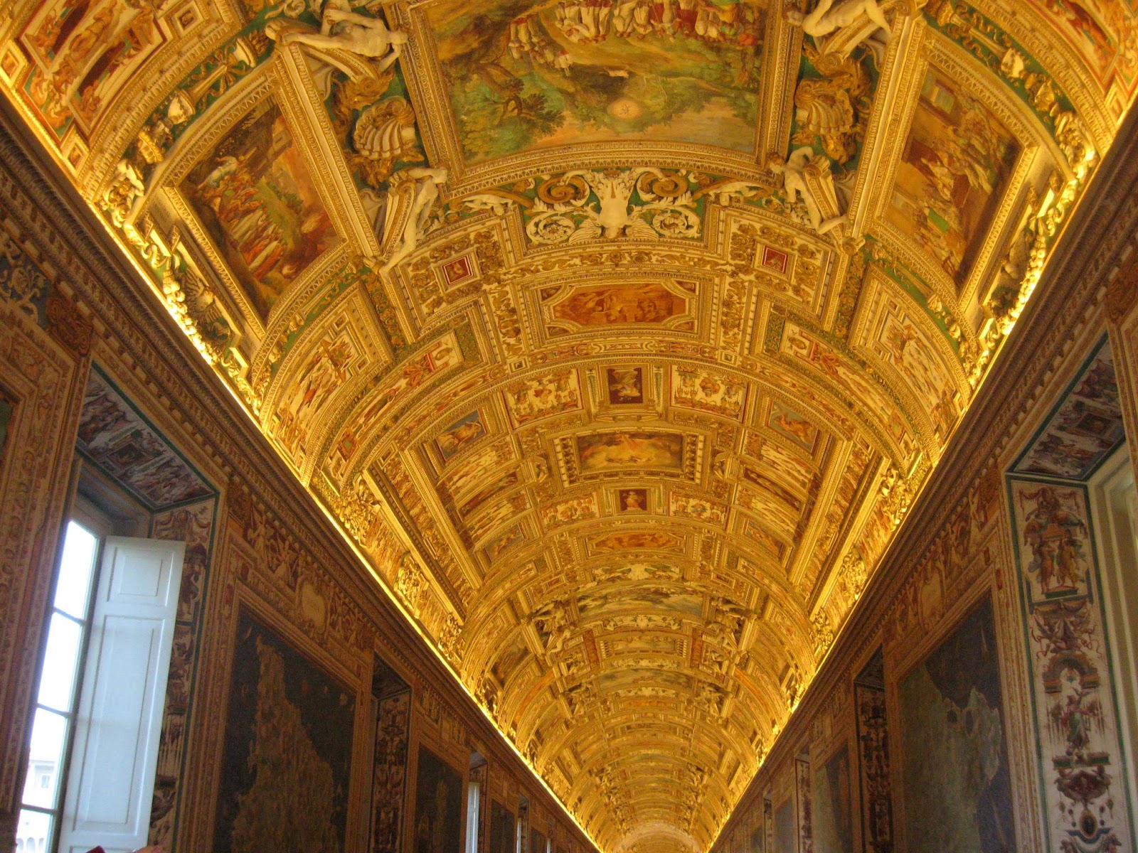 | The Hall of Maps — a very long corridor with maps of different regions of hte world on the walls between the windows. No doubt Popes paced this walk and studied the maps with very secular concerns. |
