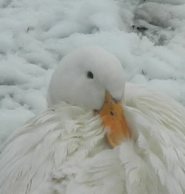 Our Aylesbury and Indian Runner duck resting in the snow with beaks tucked under the ir wings.