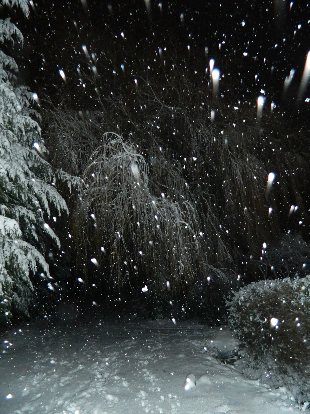 The next pictures were taken on Saturday night at about 10pm with snow falling and a flash to create this Christmas card effect